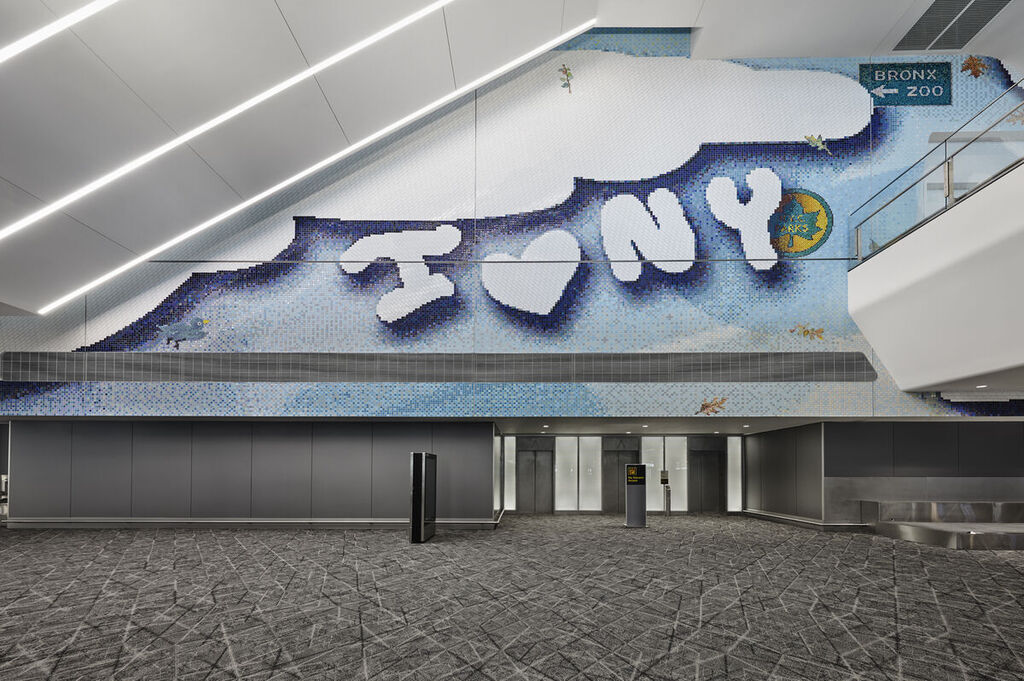 Laura Owens’s design at New York’s LaGuardia Airport Terminal B. This spectacular custom tile mosaic captures the spirit of NYC, leaving a lasting impression on travellers.